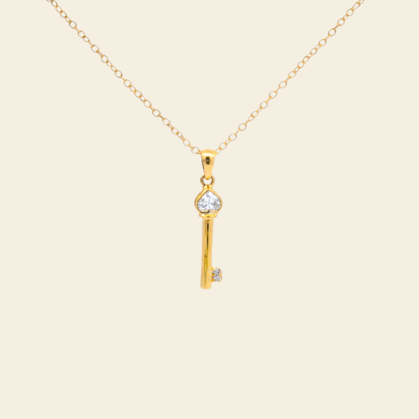 Gold necklace with a key pendant against a floral background