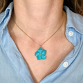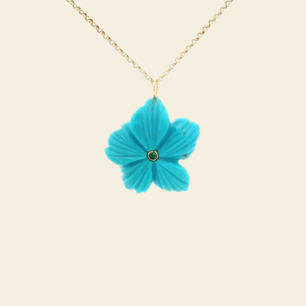 Hand-carved from vibrant Arizona turquoise, this floral pendant is accented with a rich emerald center for a striking pop of color. Finished with a classic 14k gold rolo chain, each piece is naturally unique and designed to be worn every day or layered with ease.