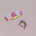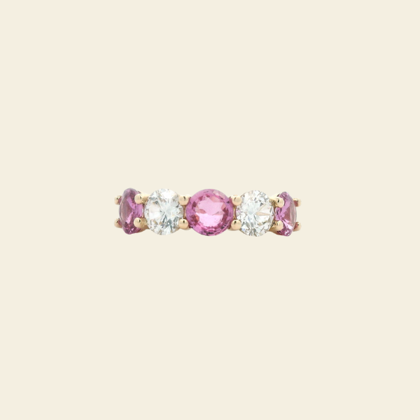 This radiant five-stone ring celebrates romance in its most joyful form. Three vibrant pink sapphires—symbols of love, passion, and tenderness—are beautifully complemented by two brilliant round diamonds, creating a harmonious blend of color and sparkle.