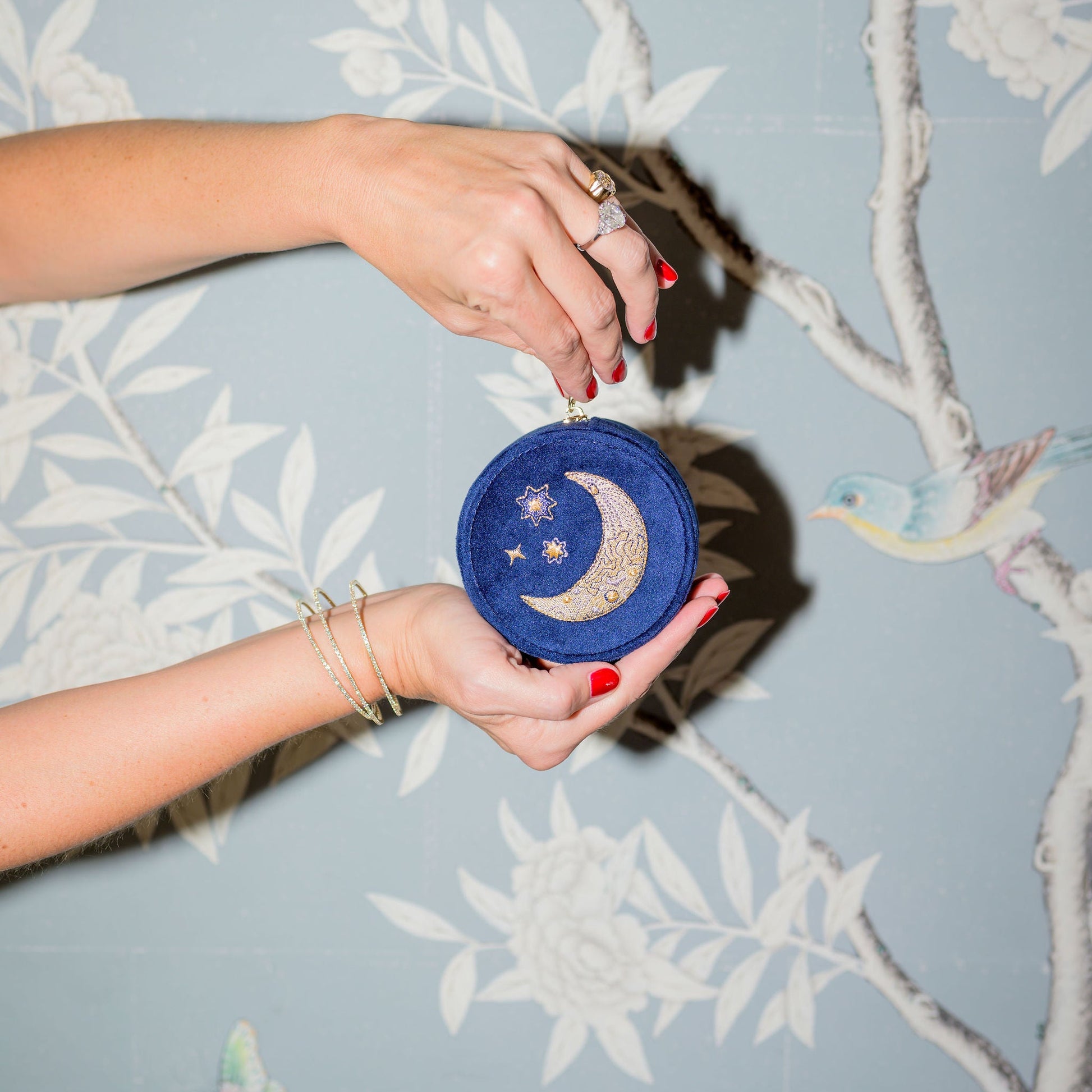 Sophisticated yet playful, this compact jewelry case is the perfect companion for life’s little adventures. A downsized take on our beloved “Fly Me to the Moon” design, it features a luxurious navy velvet exterior and delicate embroidered details. At a petite 4-inch size, it slips easily into your handbag or carry-on, ensuring your favorite jewels stay secure and stylish wherever the day—or night—takes you.