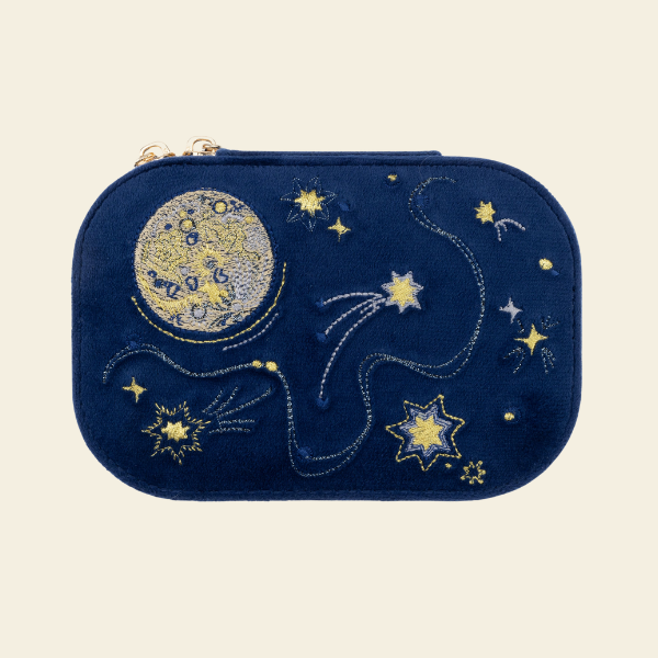 Sophisticated but playful, this travel jewelry box is your perfect companion for celestial adventures. The "Fly Me to the Moon" Travel Jewelry Zip Case combines elegance with a touch of whimsy, making it ideal for those who love to reach for the stars. With a luxurious navy velvet exterior and beautifully embroidered details, this case ensures your jewelry is both secure and stylish, ready to accompany you on all your stellar journeys.