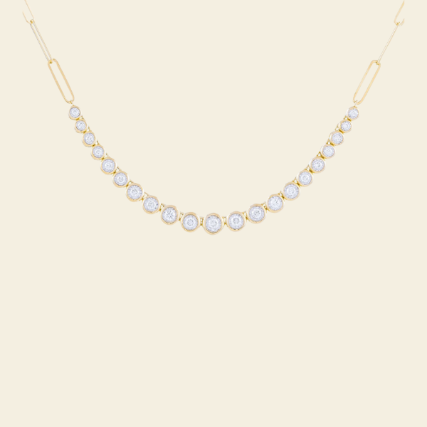 A modern classic with effortless sparkle. The Graduated Diamond Bezel Paperclip Necklace features a delicate row of bezel-set diamonds totaling 0.55 carats that gracefully increase in size, creating a soft, eye-catching gradient of brilliance.