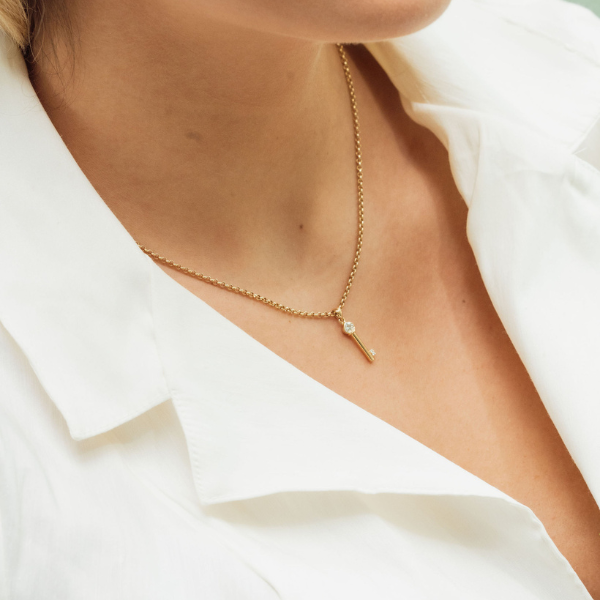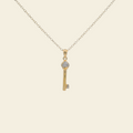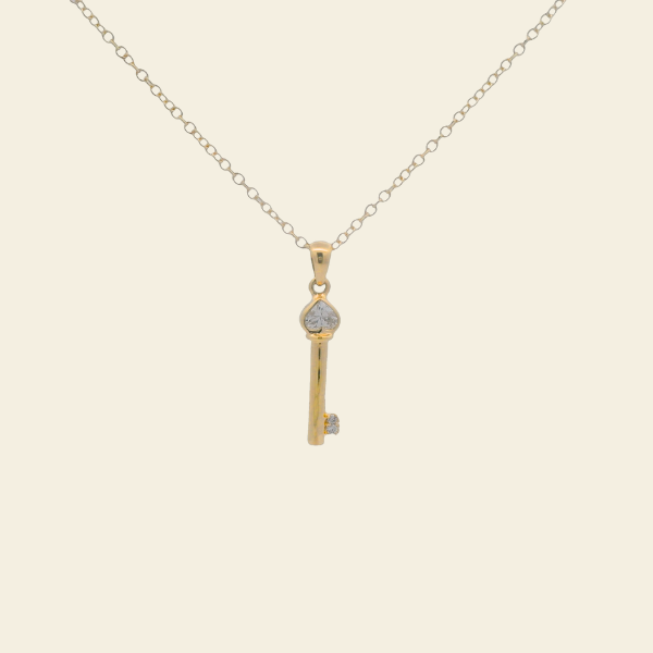 Unlock a touch of elegance with this delicate key pendant. Crafted in 18K gold, the design features a brilliant heart-shaped diamond at the top and two round diamond accents along the shaft, giving it sparkle and symbolism in equal measure. Suspended from a fine chain, it’s a modern heirloom that represents love, new beginnings, and cherished possibilities.