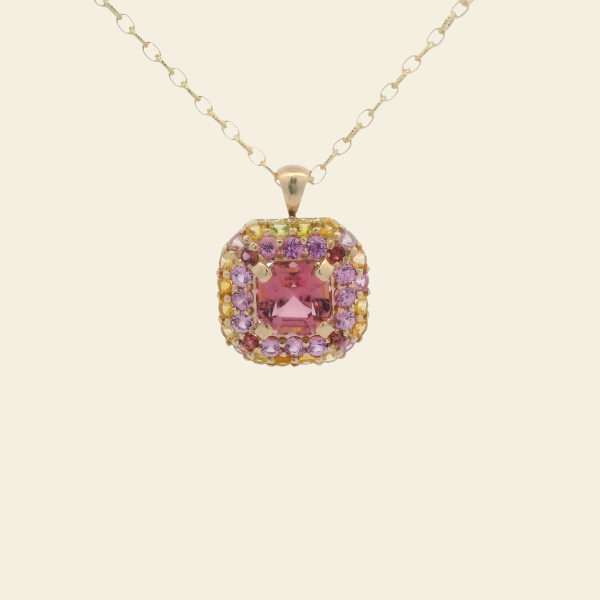 Bold color meets timeless craftsmanship in this one-of-a-kind pendant, centered around a vibrant asscher-cut pink tourmaline that glows with depth and dimension. Surrounding the center stone is a halo of pink and yellow melee sapphires, carefully selected to enhance the tourmaline’s natural brilliance and create a soft, romantic gradient of color.