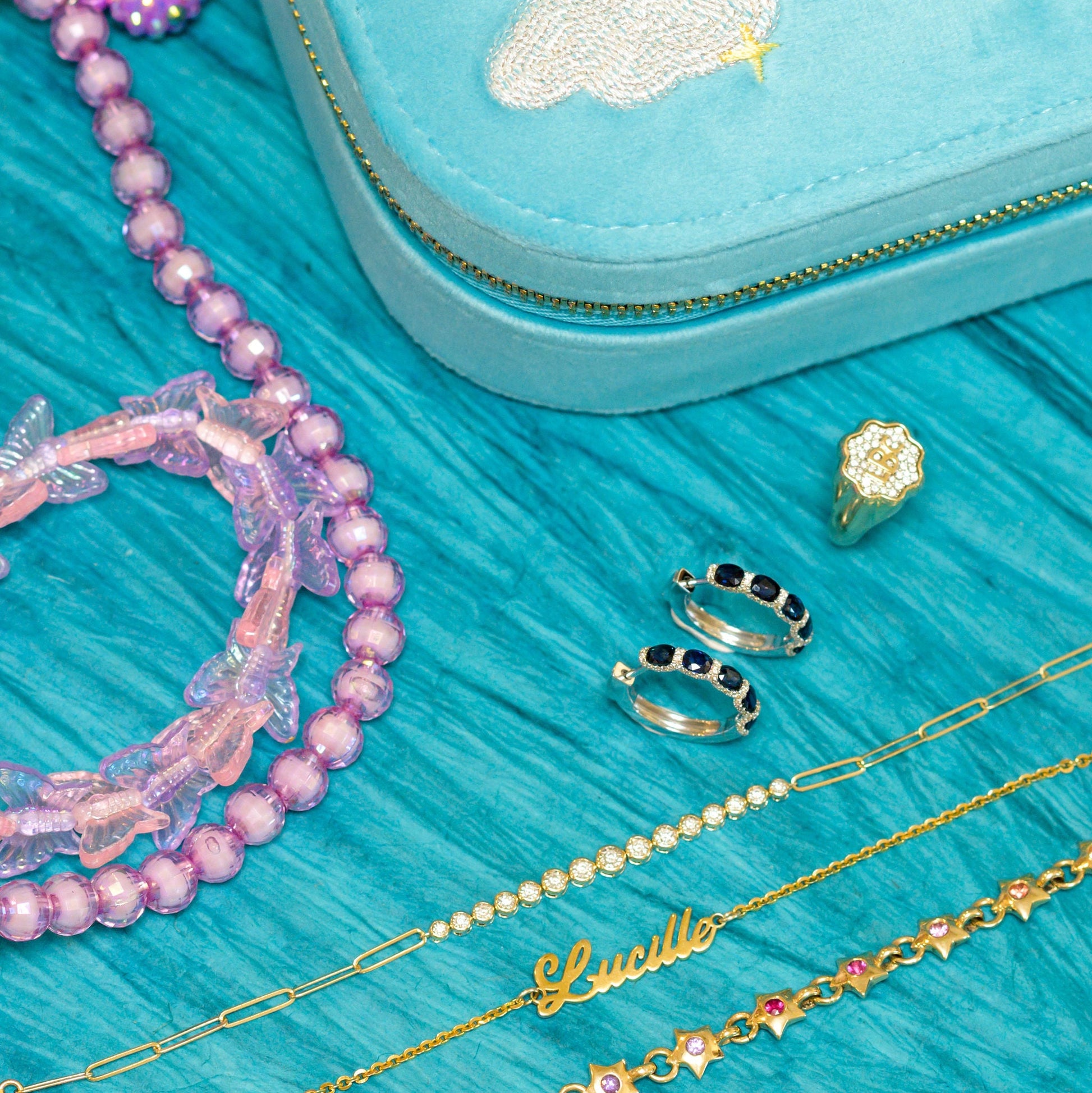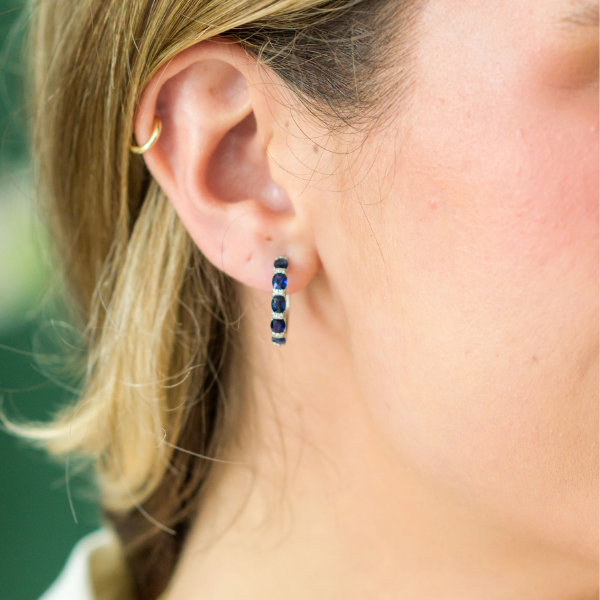 Radiant from every angle, the Sapphire & Pavé Diamond Hoops celebrate the timeless union of deep blue sapphires and sparkling white diamonds. Handcrafted in 18K white gold, each hoop features a striking row of oval-cut sapphires totaling 2.23 carats, accented by a delicate line of 0.47 carats of diamonds that enhance their brilliance with refined contrast.