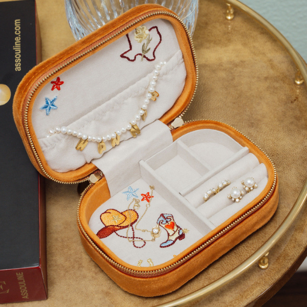 A keepsake as bold as the Lone Star State—this embroidered jewelry box is designed for the traveler with Texas in their heart. With spacious compartments, secure zip closure, and fine detailing, it keeps your heirloom pieces safe and organized while adding a touch of Southern charm to every journey.