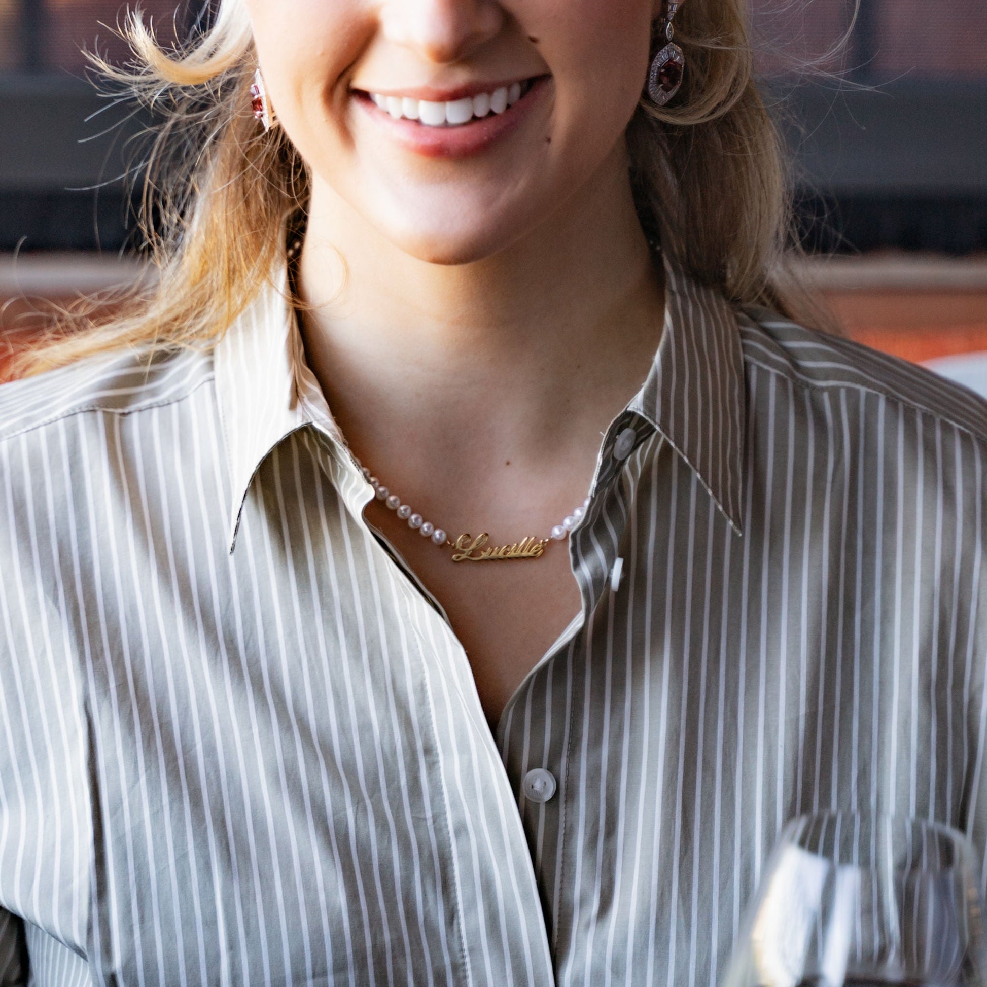 A graceful balance of classic and personal. The Tres Chic Pearl Name Necklace pairs luminous freshwater pearls with a custom 14K gold nameplate — a timeless strand made uniquely yours.
